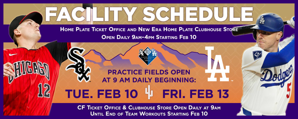 Public areas to view team workouts will open at 9 am daily starting February 10 on the White Sox side of the facility and February 13 on the Dodgers side of the facility. Camelback Ranch Ticket Offices and Clubhouse Stores will open daily at 9 am beginning February 10.
