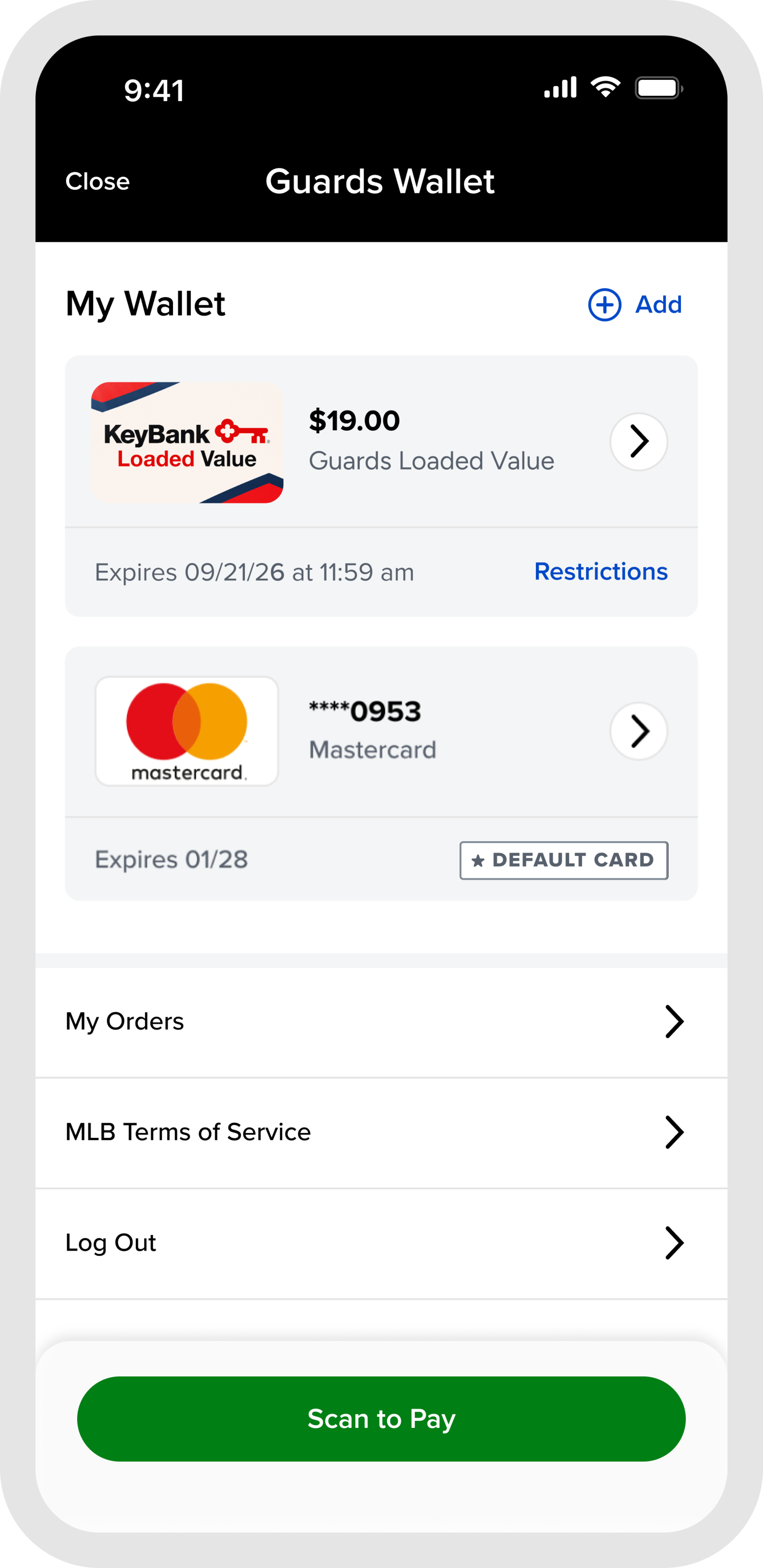 To add a new card through the MLB Ballpark app, access the Guards Wallet wallet from the Home Tab. If you do not have a card saved on file, follow the instructions to add a card. After adding a card on file, fans also have the option to save multiple cards to their wallet by selecting the "Add" button. When you save a card on file during a ticket purchase, the card will also now be available in the MLB Ballpark app the next time a fan visits the ballpark.