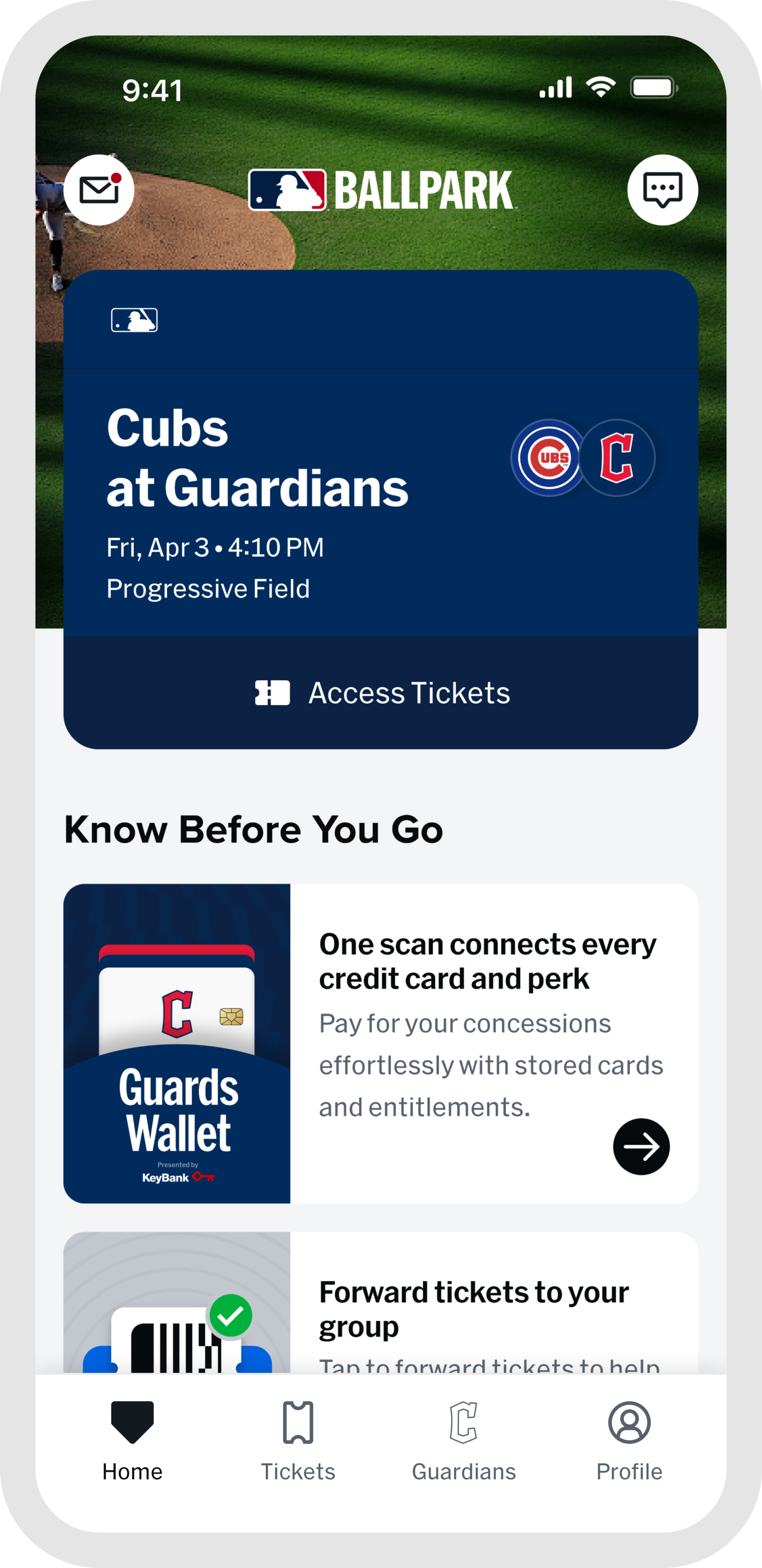 Guards Wallet presented by KeyBank provides a seamless way for fans to manage their ticket entitlements and concession credit in one centralized wallet experience. Guards Wallet presented by KeyBank is available to fans using the MLB Ballpark app at Progressive Field concession and retail locations, some restrictions may apply based on the credit or discount. Please see Terms of Use and Privacy Policy for more information.