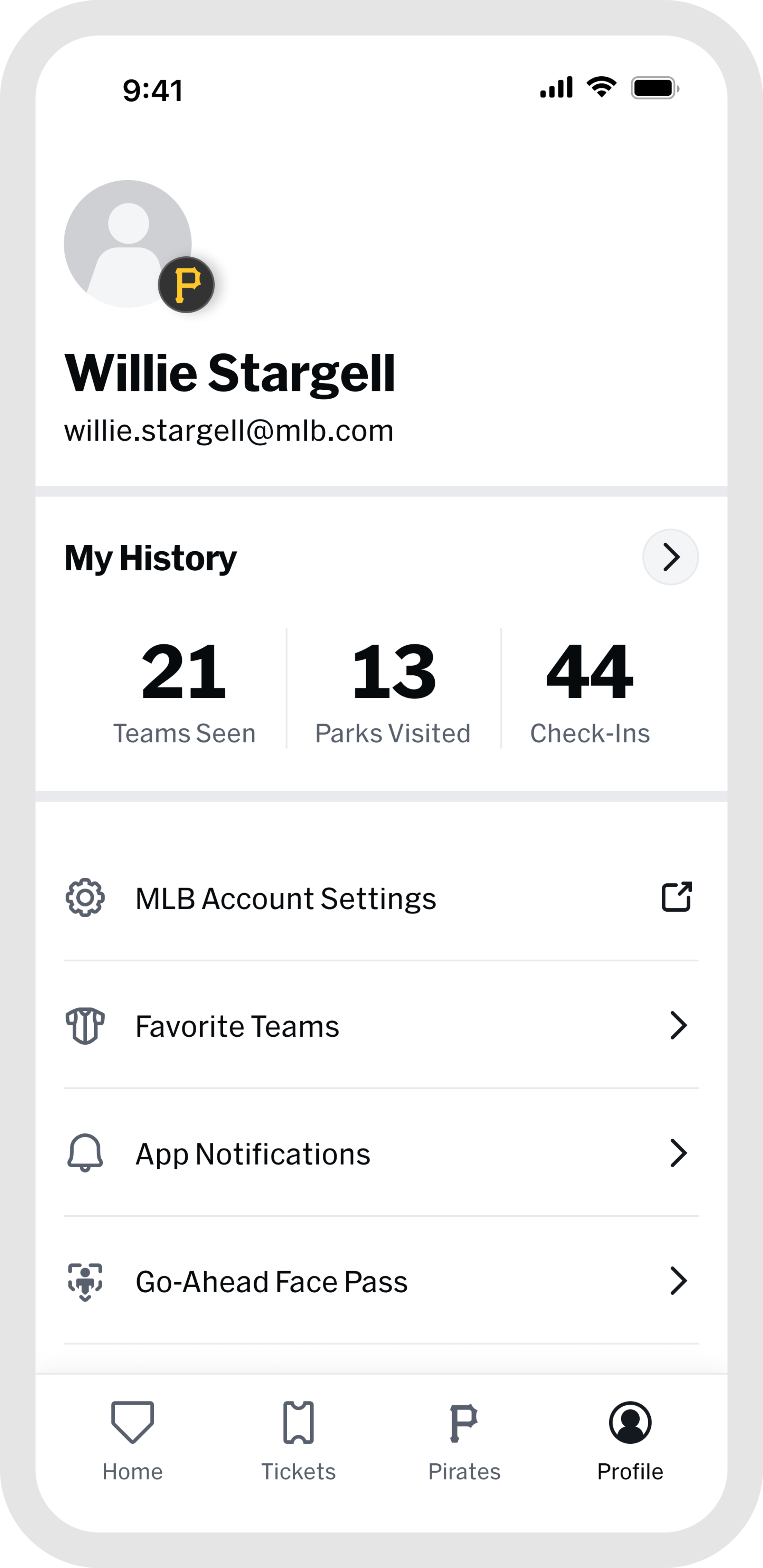 Once you are at the game, the "Home" and "Pirates" tabs are your go-to for everything venue-related. Browse stadium maps, jump into interactive games, find concession info, and access in-game features all designed to make your experience better from first pitch to final out. When the game wraps up, head to "My History" in the "Profile" tab to revisit every game you have attended, all in one place.
