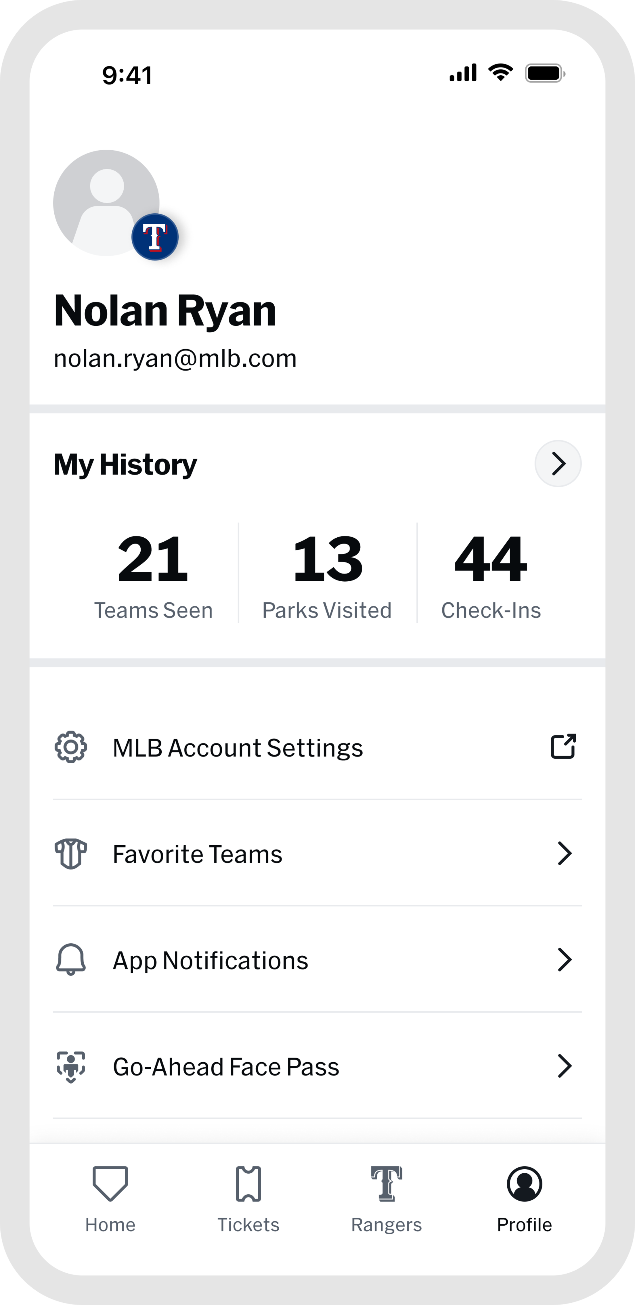 Once you are at the game, the "Home" and "Rangers" tabs are your go-to for everything venue-related. Browse stadium maps, jump into interactive games, find concession info, and access in-game features all designed to make your experience better from first pitch to final out. When the game wraps up, head to "My History" in the "Profile" tab to revisit every game you have attended, all in one place.