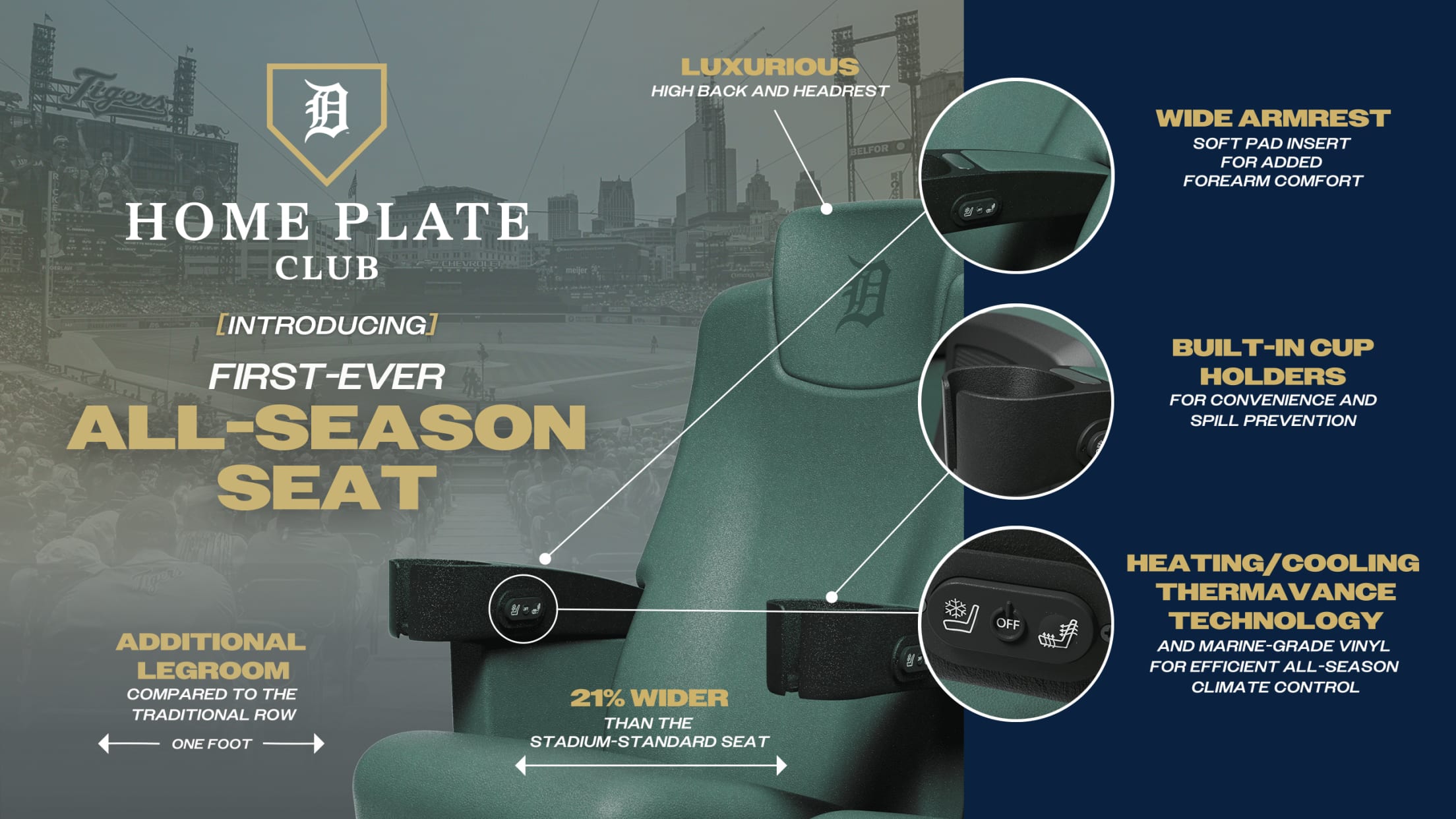 The Home Plate Club’s cutting-edge seats feature quick-touch heating and cooling climate-control technology developed by Promethient in Traverse City, Mich., allowing fans to experience enhanced comfortability while enjoying games and events at Comerica Park in all weather conditions.